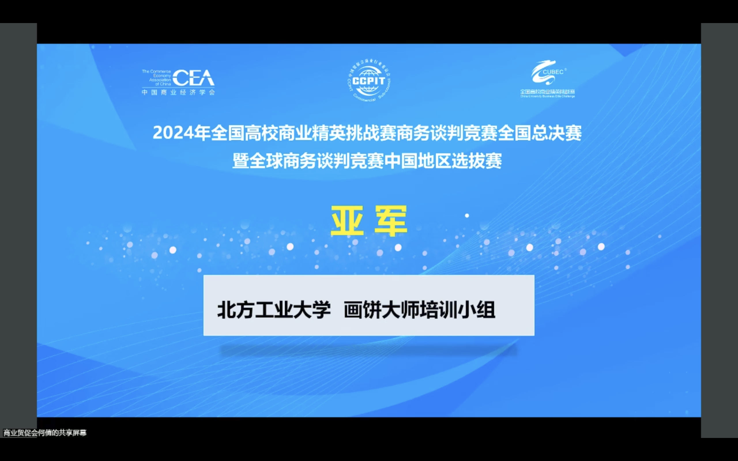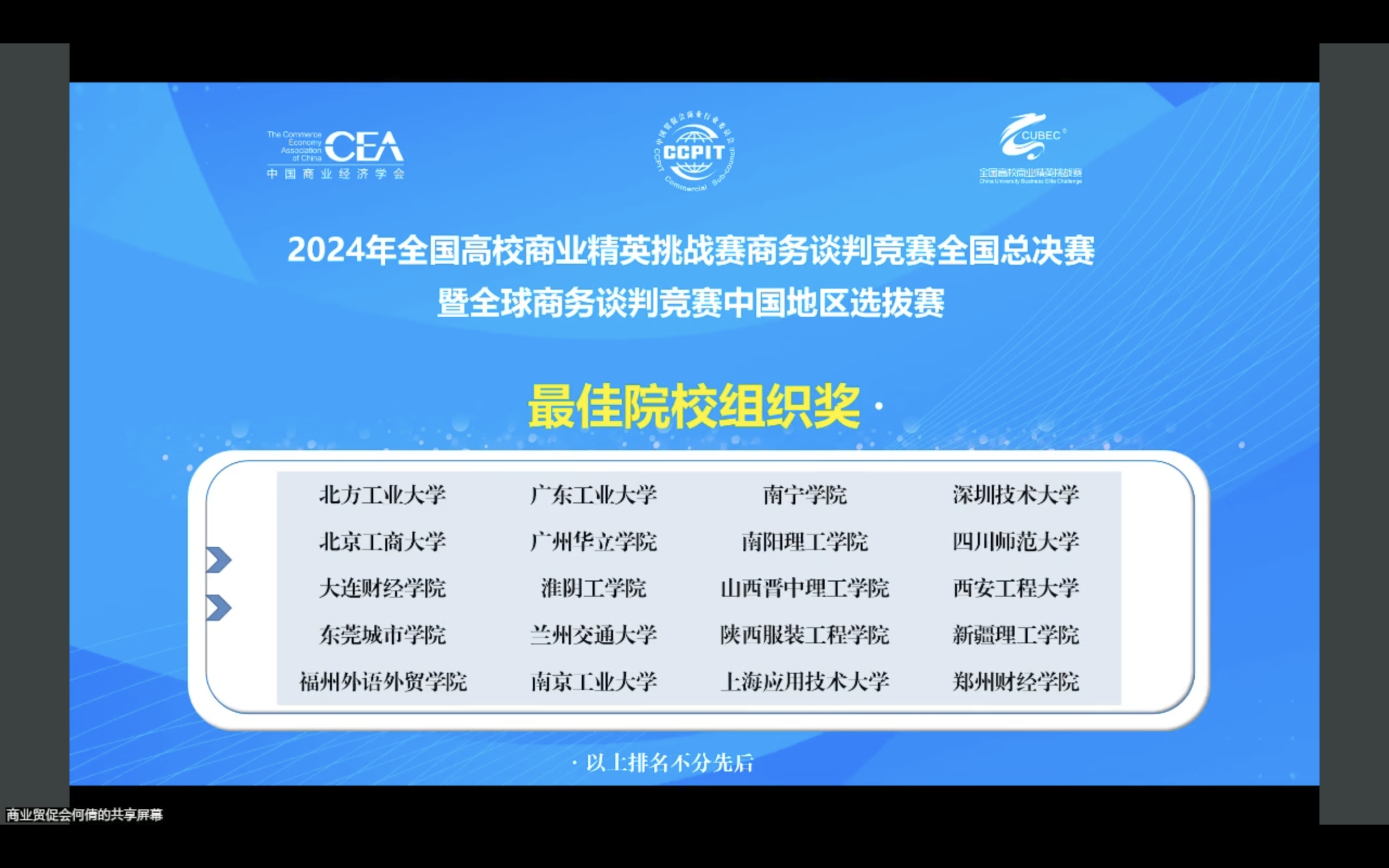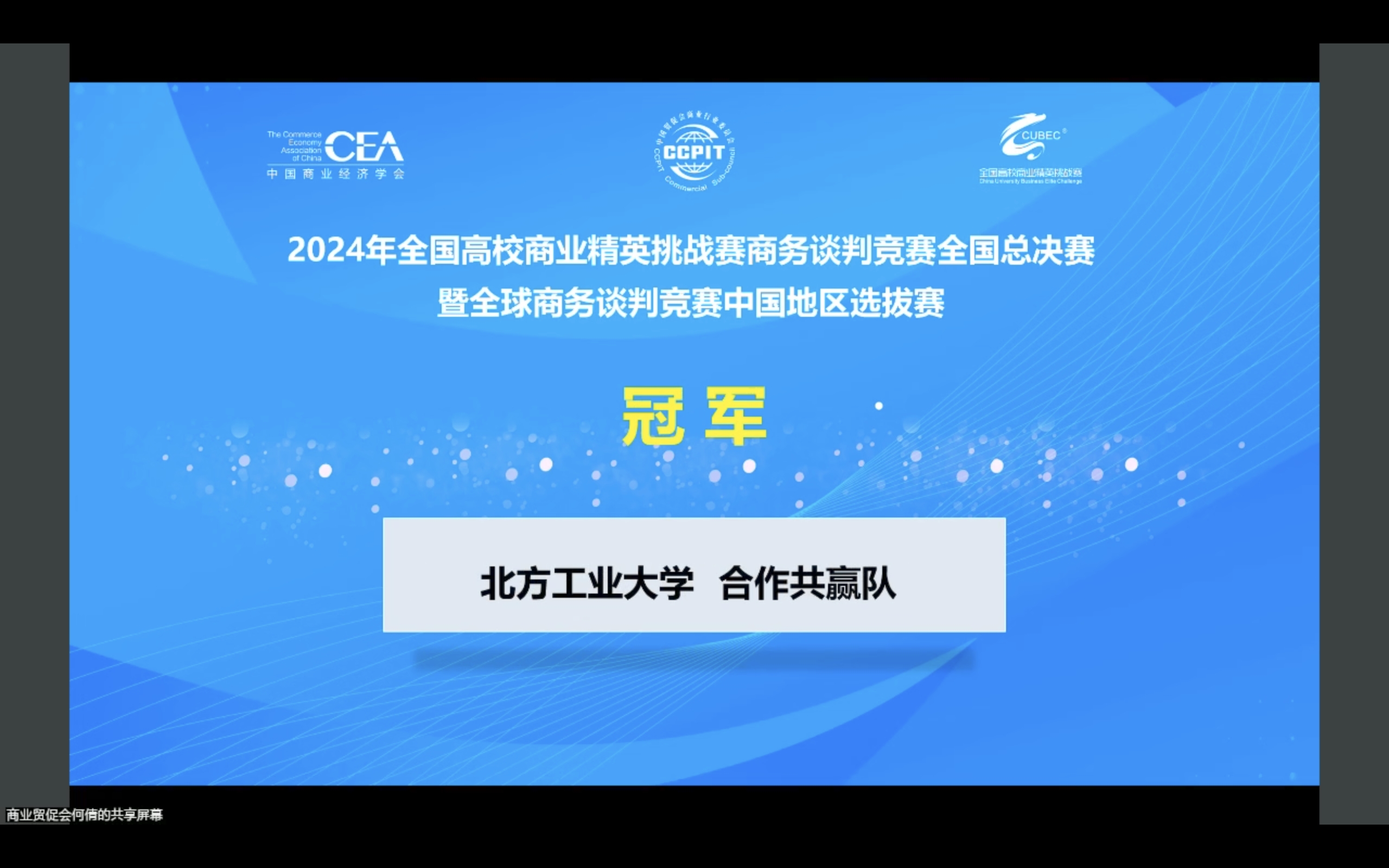 11月3日,2024年全国高校商业精英挑战赛商务谈判竞赛暨全球商务谈判竞赛中国地区选拔赛在线上圆满落幕。Beat365官方网站在总决赛中获得一等奖5项,二等奖2项,三等奖1项,最佳院校组织奖,其中合作共赢队和画饼大师培训小组获得本次竞赛的冠军和亚军。