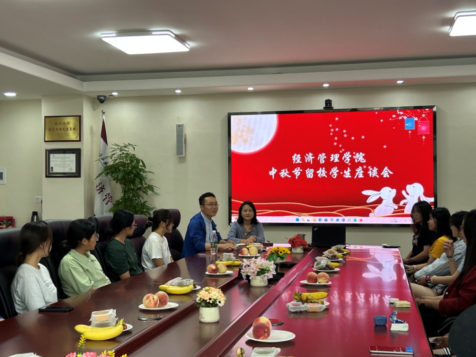 中天一轮满,秋野万里香。9月14日,经管学院于励学楼201召开中秋节留校学生座谈会。学院党委书记谢朝阳、党委副书记王帏、24级辅导员吴芳及20余名24级新生参加了活动。