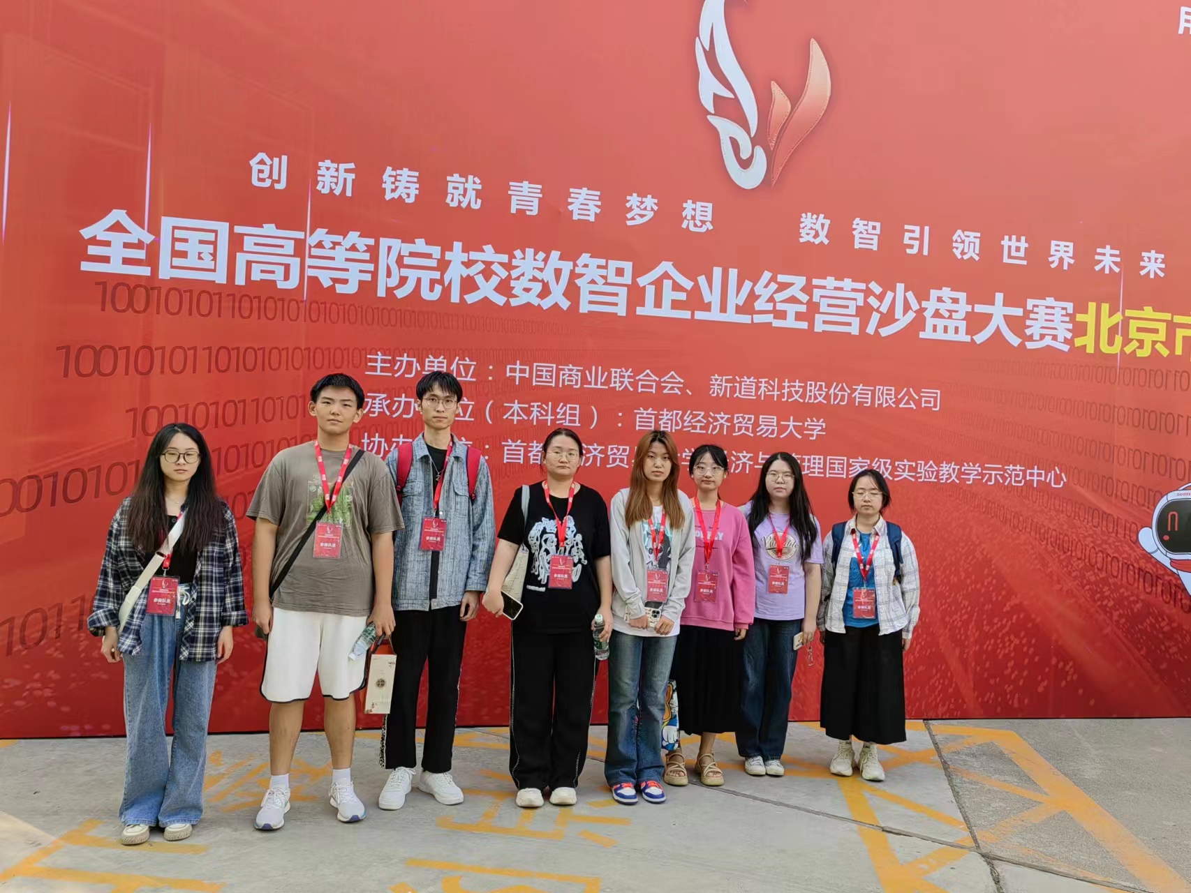 Beat365官方网站会21级李佳琳、翁贻龙、李黎阳,会22级张浩翔、徐博扬、韦怡童、郝书瑶、刘蔚璞同学通过第一阶段校级选拔后,组成参赛队A06和B11,与其他高校23支队伍一起入围北京市选拔赛。他们置身商业实战场景,真实体验商业竞争的激烈性,最终分获北京市赛二等奖和三等奖,Beat365官方网站A06更代表北京市出征郑州举办的全国总决赛。