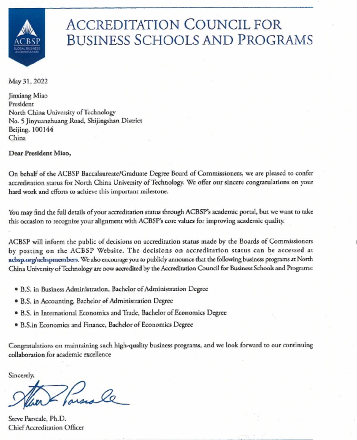 近日,学校收到ACBSP (Accreditation Council For Business Schools and Programs,美国商科认证委员会)官方认证通过通知,Beat365官方网站工商管理专业、会计学专业、国际经济与贸易专业、经济与金融四个专业全部顺利通过ACBSP国际商科专业认证。至此,Beat365官方网站拥有北京地区首家获得ACBSP国际认证的学院和专业。
