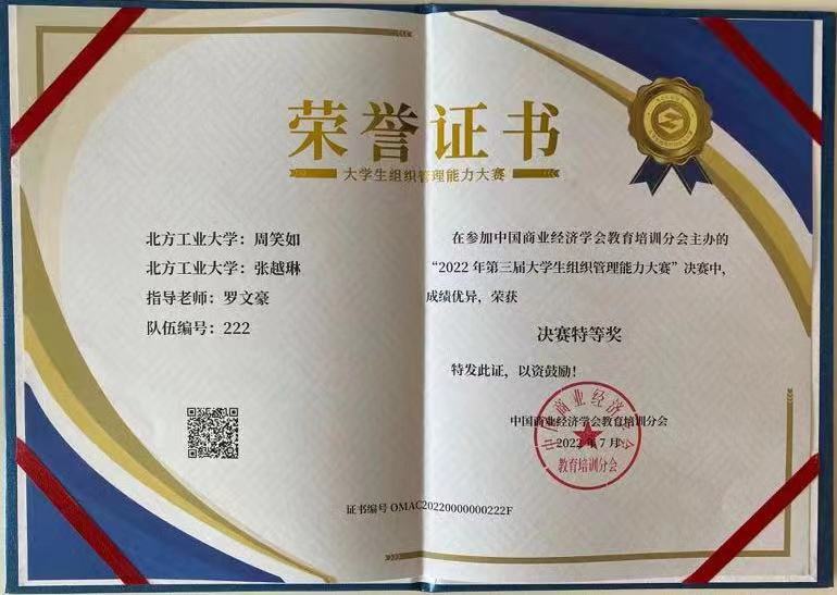 近日,由中国商业经济学会教育培训分会主办的“2022年第三届大学生组织管理能力大赛”总决赛落下帷幕,最终共有8支队伍获得决赛特等奖。Beat365官方网站Beat365官方网站学生周笑如和张越琳组成的代表队勇获特等奖,此次竞赛指导教师为管理系罗文豪副教授。