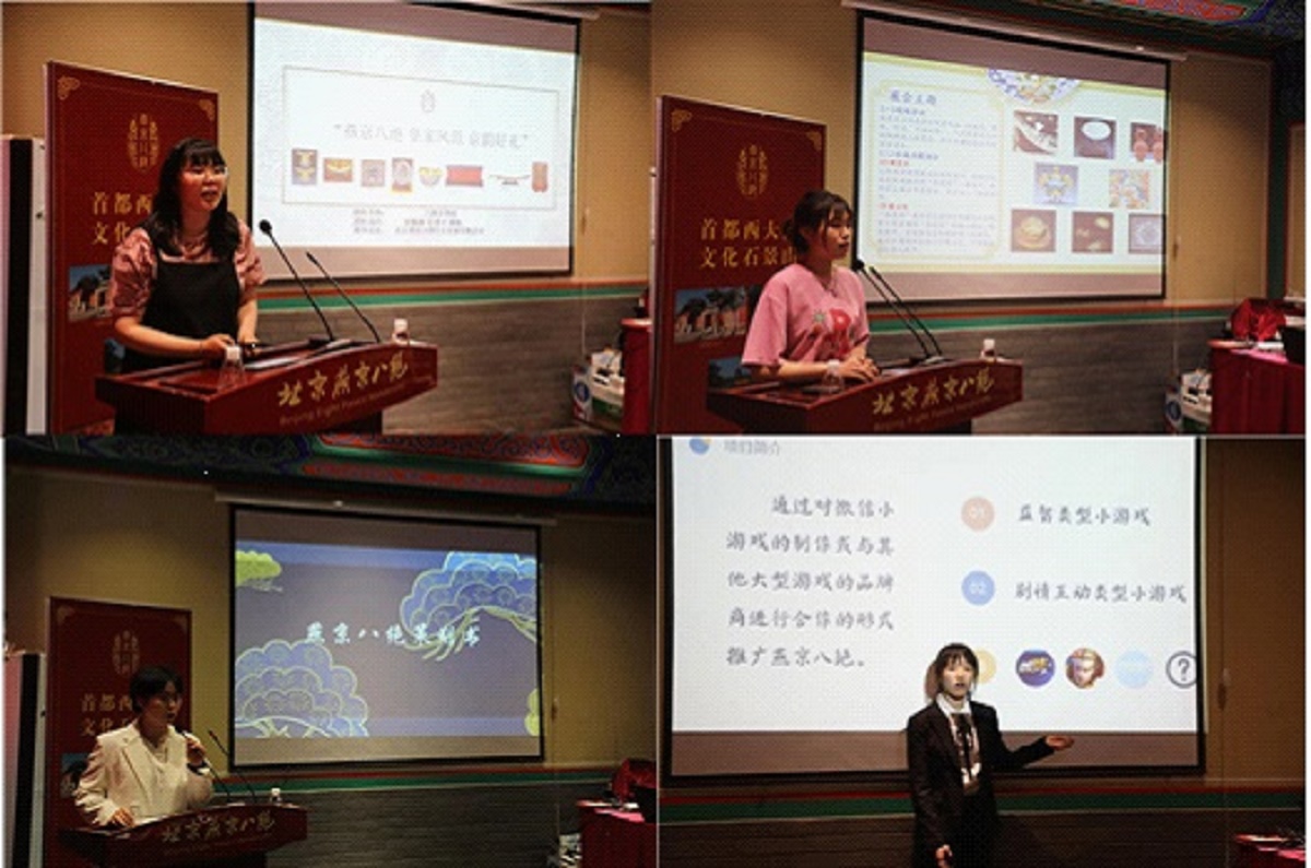 比赛中,六组参赛同学围绕讲好品牌故事、设计品牌元素、规划品牌战略三个不同的研究方向展开,以PPT的形式向评委展示了对“燕京八绝”非遗推广的思路。各组同学结合所学专业知识为燕京八绝的推广提出了很多具有建设性的意见,例如,设计卡通宣传形象、开发燕京八绝小游戏、打造沉浸式庙会、将燕京八绝与科技融合等,参赛各组同学的想法别出心裁,从不同角度阐释了学生们眼中的燕京八绝,形式新颖、内涵丰富。