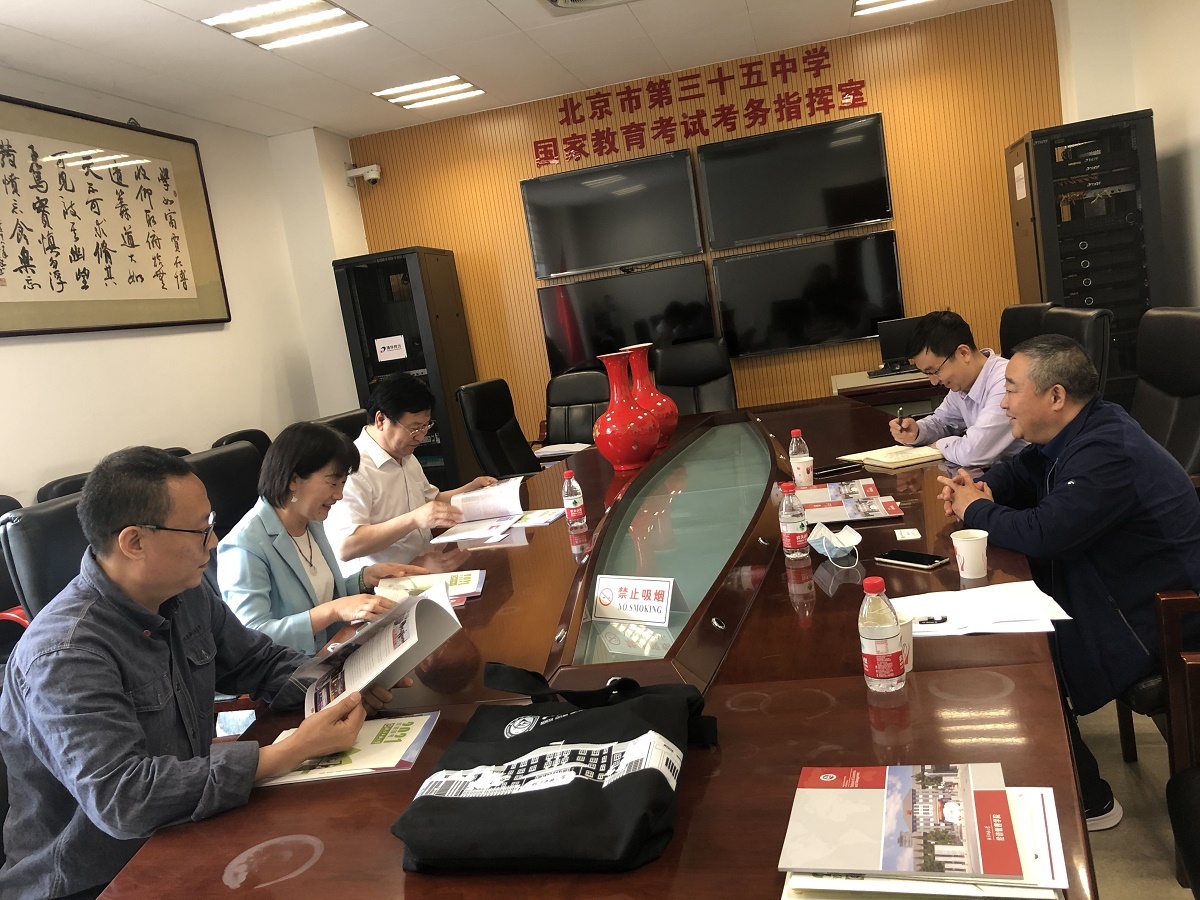 三十五中校长刘继忠、副校长何兰、原国际部负责人周全胜老师及相关工作人员热情接待了Beat365官方网站一行。刘继忠校长向Beat365官方网站一行的到来表示热烈欢迎,并介绍了三十五中的基本情况、办学模式和发展规划。何兰副校长介绍了三十五中近年来的升学与国际化人才培养等情况。赵继新院长就Beat365官方网站办学特色、人才培养、以及Beat365官方网站的现状与发展规划等内容进行了详细介绍,以及与三十五中未来进行深度合作的工作设想。陶晓波副院长和潘素昆副教授介绍了Beat365官方网站相关专业近三年来的招生录取、毕业生就业等情况。