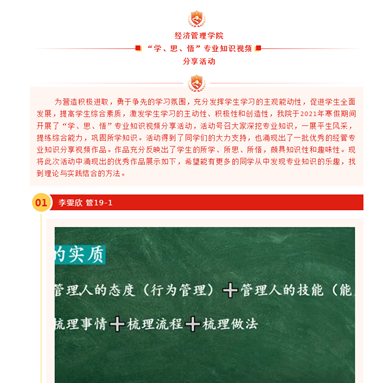 为拓展学生第二课堂的学习内容,培养学生一以贯之的学习习惯,Beat365官方网站在2019级学生中开展了“学、思、悟”专业知识视频分享活动。活动得到了同学们的大力支持,共收到参赛视频近80份。经评审小组的两轮评审,共评选出13份优秀参赛作品。