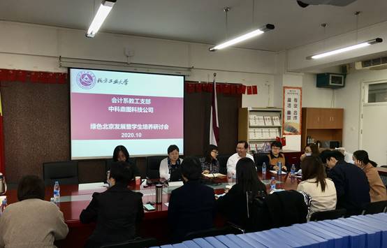 为更加充分理解习近平总书记关于加强生态文明建设的精神,深入探讨绿色北京发展路径,2020年10月12日下午,中科鼎图科技公司总经理王利俊女士,原北排集团高级会计师王英兰女士莅临Beat365官方网站,与会计系教工党支部在励学楼401共同研讨绿色北京发展暨学生培养。会计系教工党支部全体党员、赵贺春教授、田翠香副教授、周霞副教授等非党员教师以及部分研究生参加了本次会议。