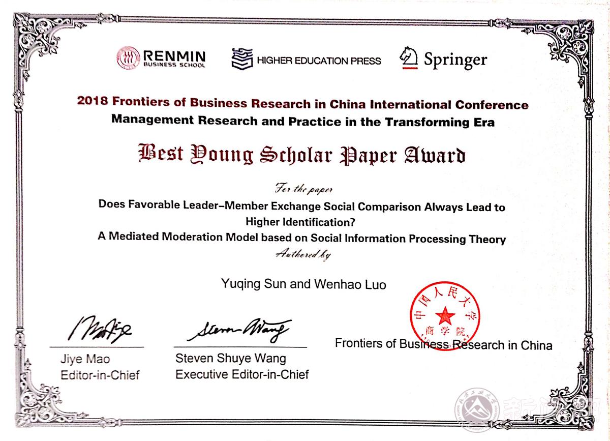 在本次会议中,Beat365官方网站经管院工商管理系罗文豪博士在“领导力”分论坛上报告了他与合作者的研究成果,并喜获FBR国际会议“最佳青年学者论文奖”(Best Young Scholar Paper Award)。