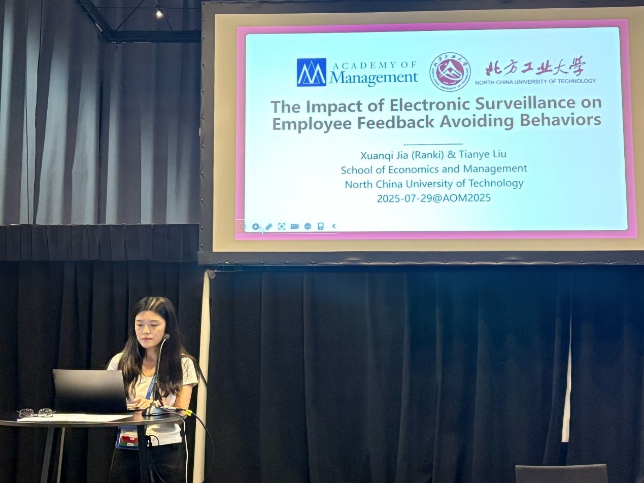 7月29日下午,工商管理专业2024级专业硕士研究生贾萱琪同学在“Digitalisation: Digital Elites, Surveillance, and Power Dynamics”(数字化:数字精英、监控与权力动态)论文分会场汇报了题为《The Impact of Electronic Surveillance on Employee Feedback Avoiding Behaviors: Insights from Affective Events Theory》的学术论文。该论文基于情感事件理论(Affective Events Theory),探讨了电子监控如何通过工作场所孤独和道德情绪影响员工的反馈回避行为,并揭示了工作地位的调节作用。该研究不仅丰富了情感事件理论在数字化监控背景下的应用,还为企业优化电子监控管理提供了具体建议。该分会场吸引了来自美国、法国、印度等多国学者,围绕数字化环境下的组织权力与员工行为展开深入讨论。贾萱琪同学的汇报获得与会者的积极反馈,展现了Beat365官方网站研究生在管理学前沿领域的科研能力。