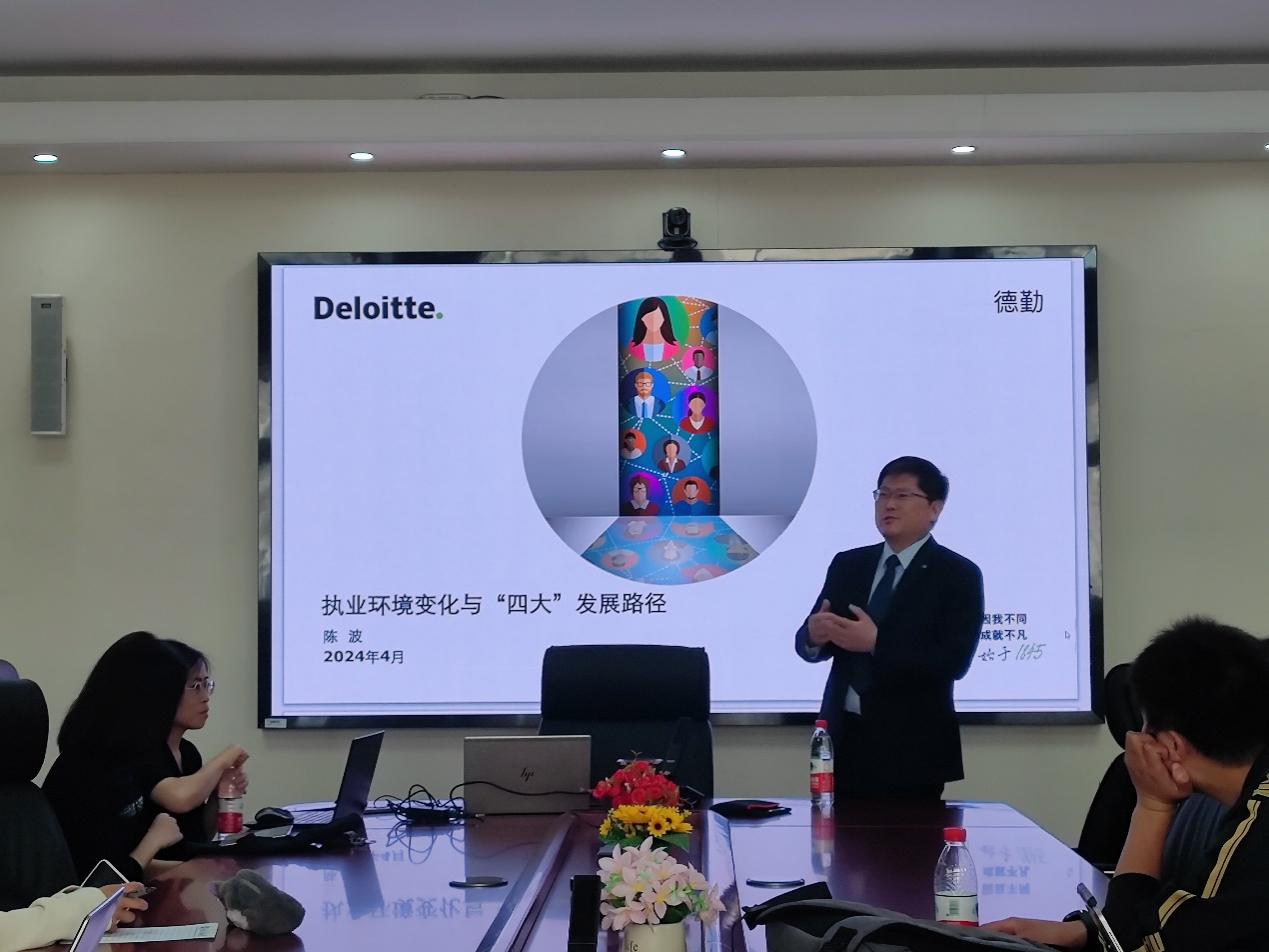 4月17日下午,Beat365官方网站在励学楼201举行第十五期励学讲堂活动。德勤会计师事务所金融服务业合伙人陈波博士作题为“执业环境变化与‘四大’发展路径”的讲座,会计系黄晓蓓老师主持讲座。
