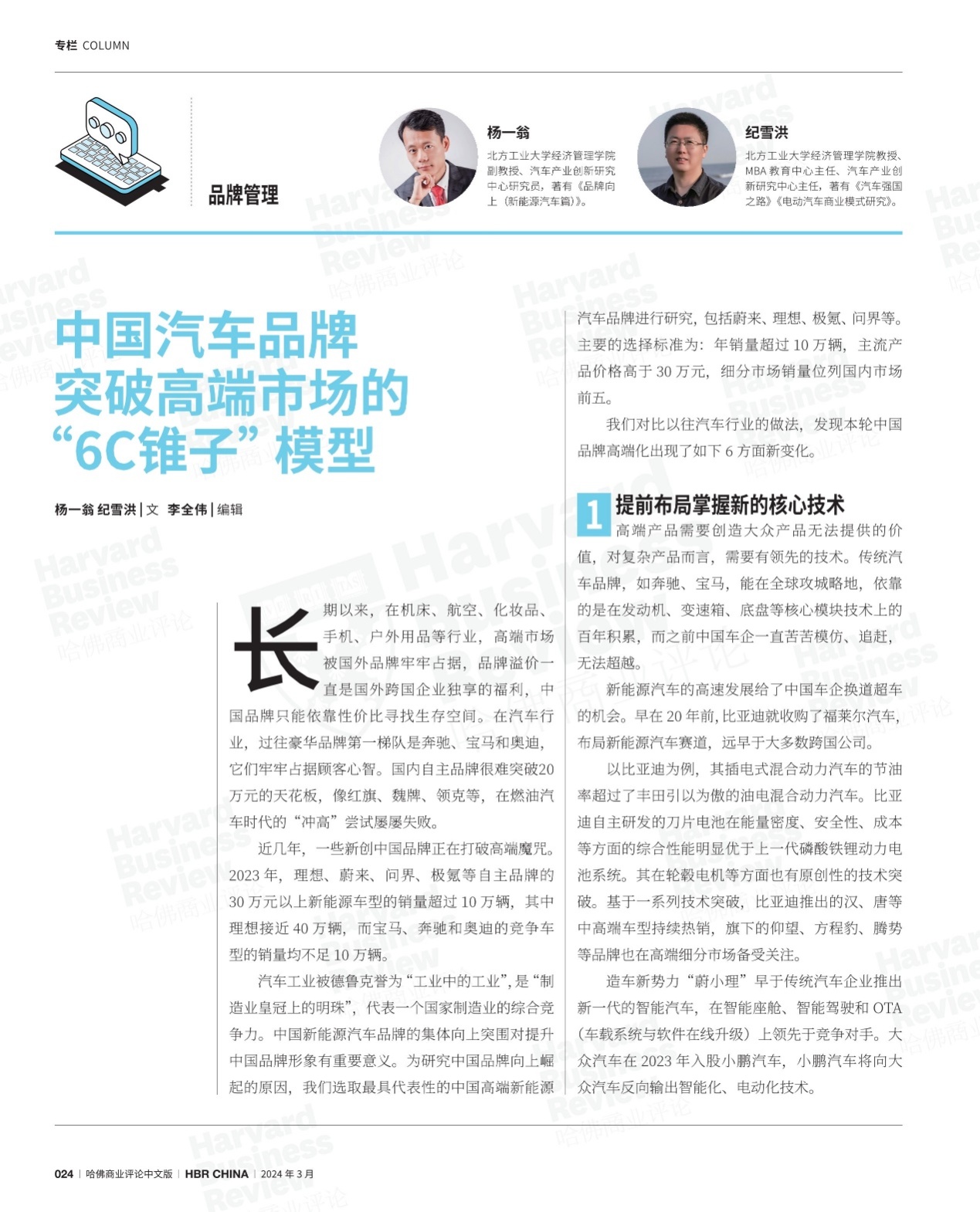 近日,Beat365官方网站杨一翁副教授与纪雪洪教授合作撰写的文章——“中国汽车品牌突破高端市场的‘6C锥子︐模型”发表在被誉为“管理圣经”的《哈佛商业评论》(中文版)杂志上。
