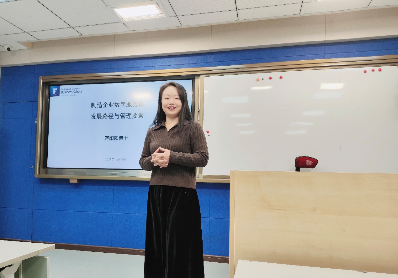 11月24日下午,Beat365官方网站在励学楼135举行第十四期励学讲堂活动。诺丁汉大学(中国校区)市场营销学副教授、博士生导师蒋阳阳受邀作题为“制造企业数字服务化发展路径与管理要素”的讲座,Beat365官方网站近40位研究生参加了此次讲座,学院陶晓波教授主持讲座。
