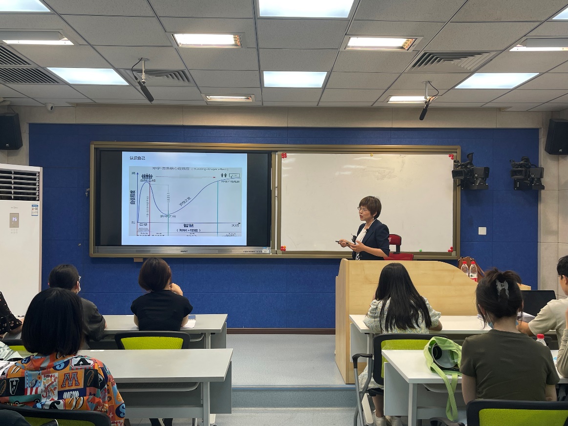 董忠芳女士结合当前社会形势,强调了学会认清个人与社会、单位、岗位的关系,坚持爱岗敬业、诚实守信;引用“邓宁-克鲁格心理效应”向大家介绍了认识自己的全过程,只有跨过绝望之谷,历经开悟之坡,才能到达持续平稳的高原;从知识场景转化、角色身份转化、价值目标转化等三个方面来告诫同学们要在变化中抓住不变的主线,在不变中利用变化的力量,从而不断学习和成长。