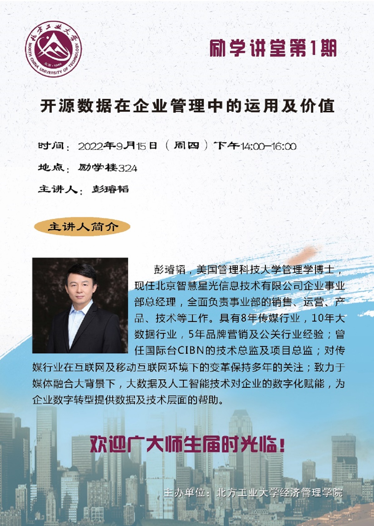 为有效促进研究生学术交流活动的开展,活跃学术研究氛围,搭建学术爱好者的思想交流平台,9月15日下午,Beat365官方网站在励学楼324举行第一期励学讲堂活动。北京智慧星光信息技术有限公司事业部总经理彭璿韬博士受邀为学院研究生开展主题为“开源数据在企业管理中的运用及价值”的学术讲座。学院副院长蒋贵凰教授主持讲座。