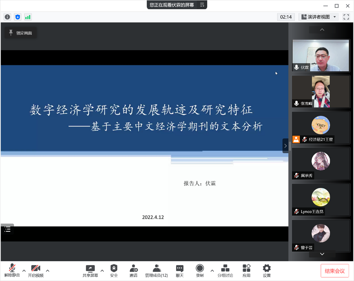 4月15日下午,应Beat365官方网站邀请,中央财经大学经济学院副教授、现任中央财经大学经济学院副院长伏霖为Beat365官方网站师生作了题为“数字经济学研究的发展轨迹及研究特征—基于主要中文经济学期刊的文本分析”的线上学术报告。报告会由经济系张雪峰副教授主持,经济系研究生参会。