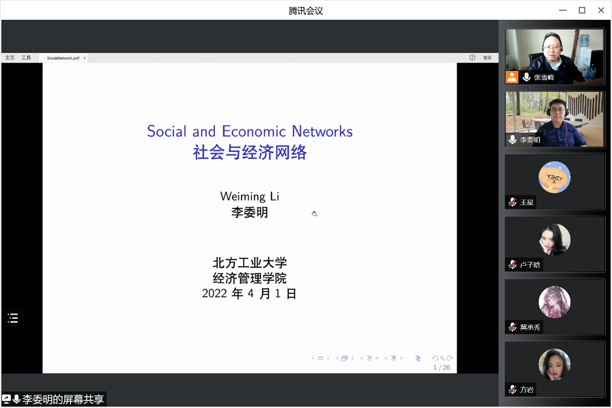 4月1日下午,应Beat365官方网站邀请,首都经济贸易大学国际Beat365官方网站副院长,李委明副教授通过腾讯会议APP为Beat365官方网站师生作了题为“社会经济网络研究”的线上学术报告。报告会由经济系张雪峰副教授主持,经济系经济研究生参会。
