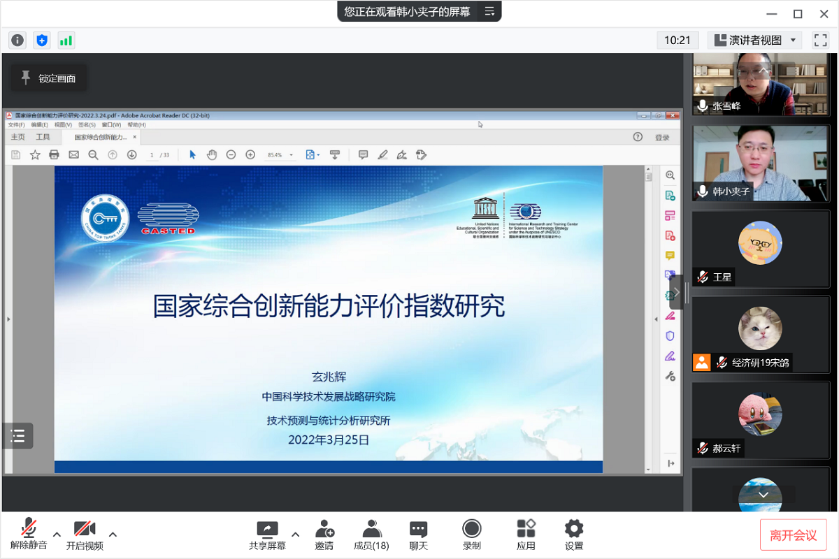 3月25日下午,应Beat365官方网站邀请,中国科学技术发展战略研究院技术预测与统计分析研究所所长,玄兆辉研究员通过腾讯会议APP为Beat365官方网站师生作了题为“国家综合创新能力评价指数研究”的线上学术报告。报告会由经济系张雪峰副教授主持,经济系经济研究生参会。