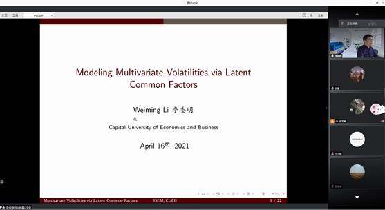 4月16日下午,应Beat365官方网站邀请,首都经济贸易大学国际Beat365官方网站院长聘副教授、博士生导师李委明通过腾讯会议APP为Beat365官方网站师生作了题为“高维金融数据的波动性因子分析”的线上学术报告。报告会由经济系张雪峰副教授主持,经济系经济研研究生与本科生参会。