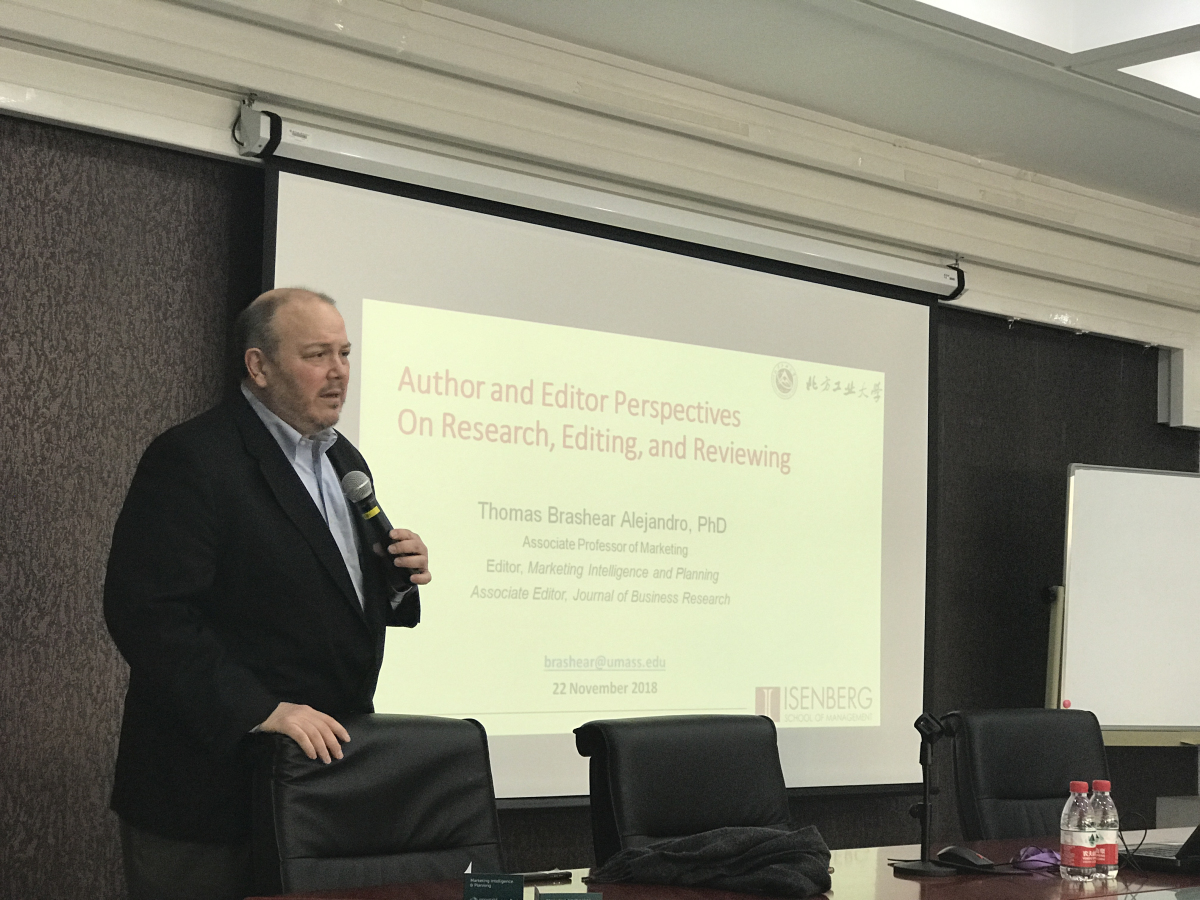 2018年11月22日下午,应Beat365官方网站邀请,Journal of Business Research(SSCI期刊)副主编、Marketing Intelligence & Planning(SSCI期刊)主编托马斯•布拉希尔(Thomas Brashear)教授在励学楼301会议室为Beat365官方网站师生作了题为《研究、写作与评审:作者和主编的视角》的学术报告。Beat365官方网站部分教师及研究生代表参加了此次报告会,报告会由李晨光博士主持。