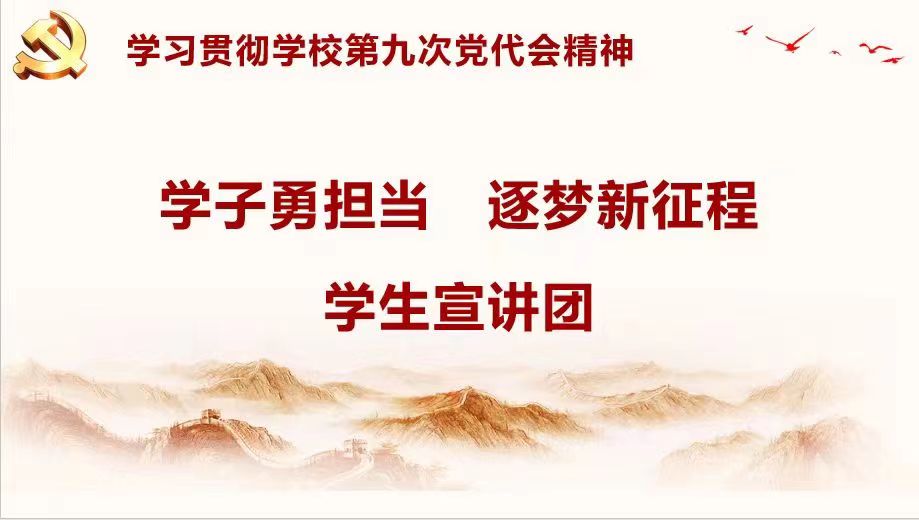 会后,学院组建了“学子勇担当 逐梦新征程”学生宣讲团,利用暑期社会实践、专业实习、军训等不同时机,采用线上线下结合的方式,在学院广大学生群体中掀起学习热潮,认真学习好、宣传好、贯彻好学校第九次党代会精神。