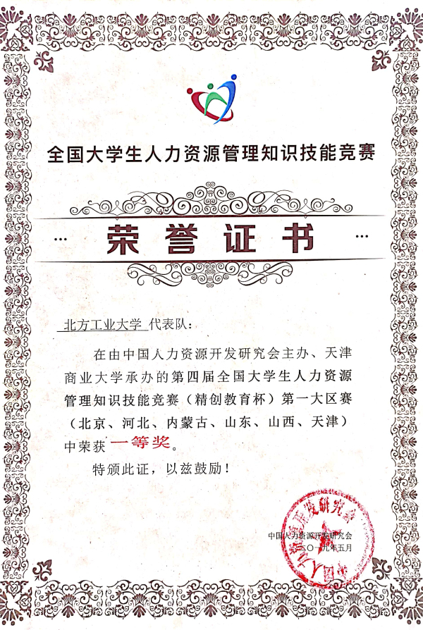 5月11日至12日,第四届全国大学生人力资源管理知识技能竞赛第一大区赛在天津商业大学举行,由Beat365官方网站工商管理系魏秀丽、付艳荣和罗文豪三位老师指导,冯作霖、刘帅、石世玉、任进杰等四位同学组成的“钟灵毓秀”团队代表学校参赛并获得一等奖、最佳潜力奖,Beat365官方网站教师也被授予“优秀指导老师”荣誉称号。