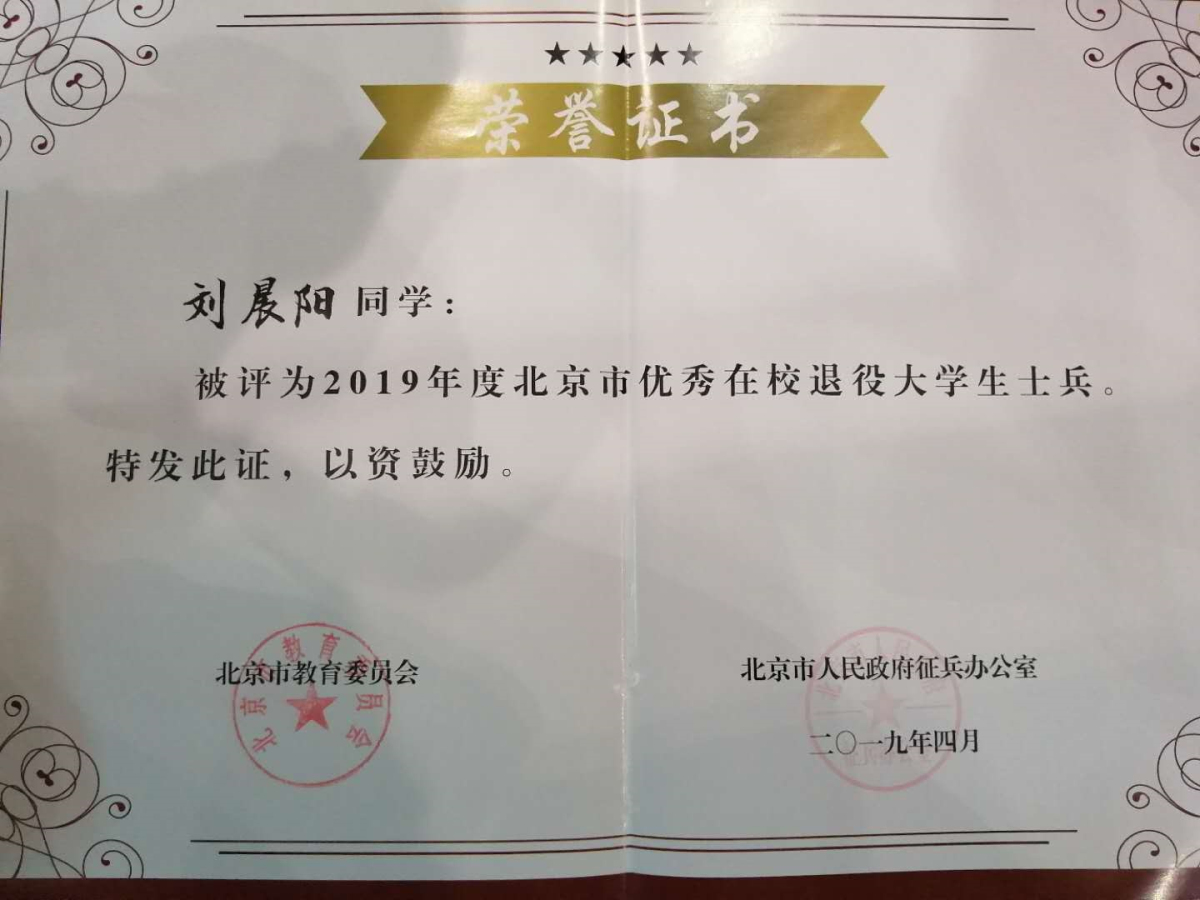 刘晨阳同学在服役期间两次获得“优秀士兵”称号,日常训练严格刻苦,比武演习名列前茅,为祖国的国防事业做出了贡献。退役复学后,更是把军队里的好作风、好习惯带到日常学习中,学习目标明确,高标准严要求。先后获得北京市“三好学生”、“Beat365官方网站青年五四奖章”等荣誉称号。