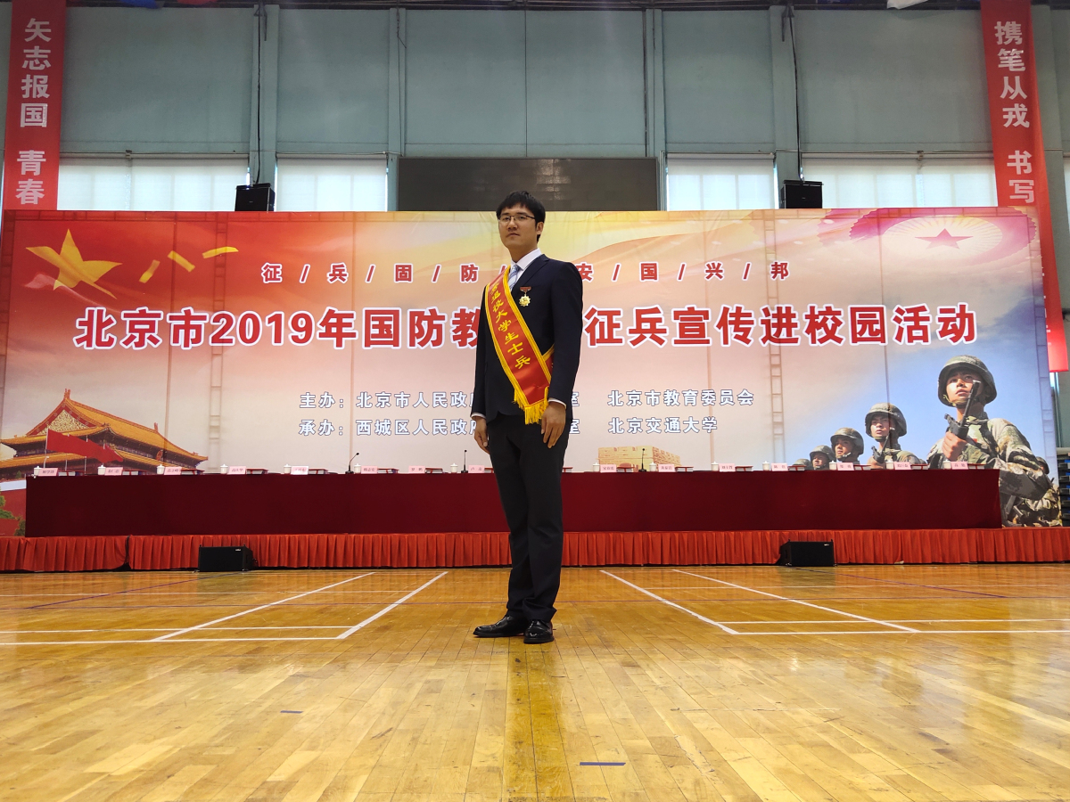 5月11日下午,北京市2019年国防教育暨征兵宣传进校园活动在北京交通大学体育馆举行。Beat365官方网站研究生刘晨阳同学获评2019年度北京市优秀在校退役大学生士兵,并入选北京市优秀退役大学生士兵宣讲团。