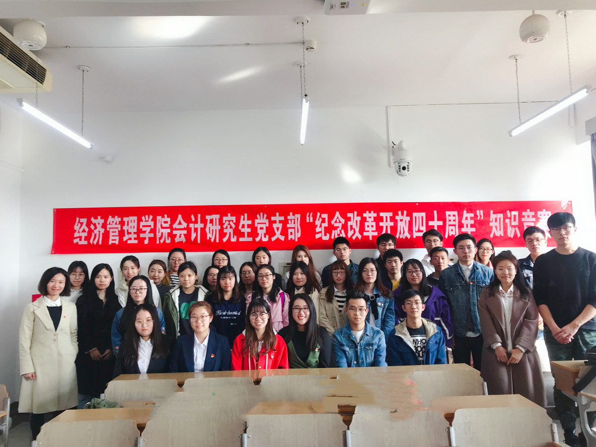 10月18日下午,Beat365官方网站会计研究生党支部于励学楼519教室开展了“庆祝改革开放四十周年”主题知识竞赛活动,来自会计研究生党支部的四十名党员、预备党员和积极分子参与了本次竞赛活动。