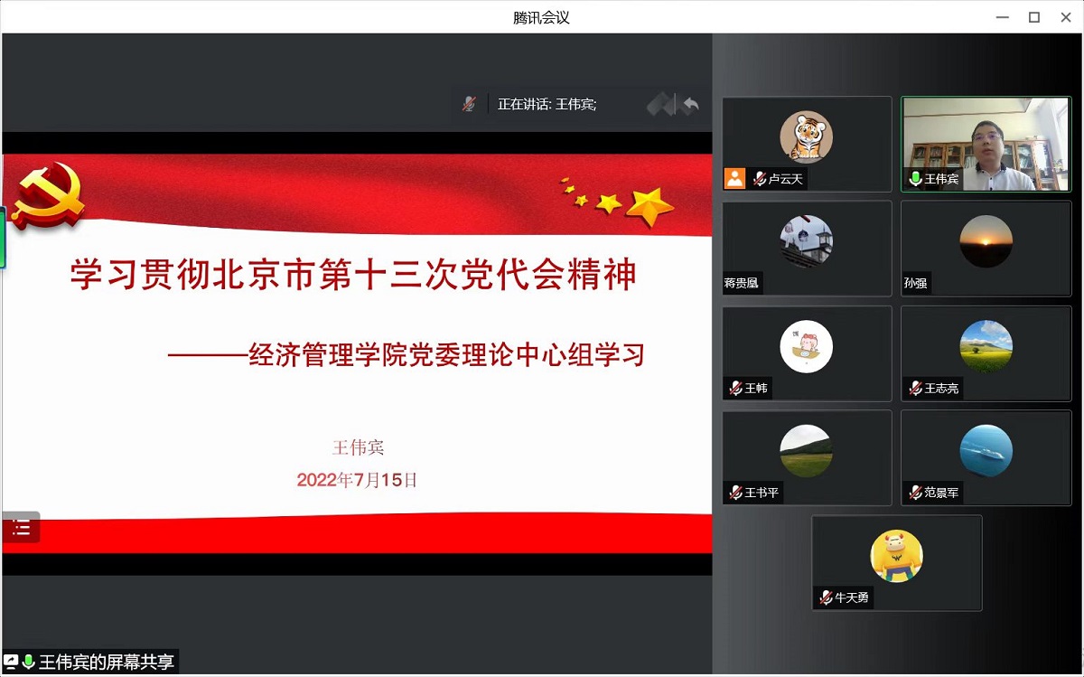 7月15日下午,Beat365官方网站党委通过线上会议形式召开理论中心组学习会议,集中学习北京市第十三次党代会精神。会议由学院党委书记王伟宾主讲,全体党委委员参与了此次会议。