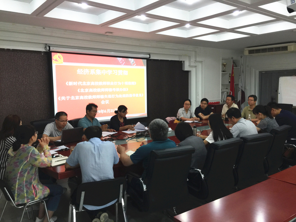 为深入贯彻习近平新时代中国特色社会主义思想和党的十九大精神,深入贯彻落实全国和北京市教育大会精神,6月21日上午,经济系全体教师在励学楼301会议室集中学习《新时代北京高校教师职业行为十项准则》、《北京高校教师师德考核办法》、《关于北京高校教师师德失范行为处理的指导意见》等三个文件。Beat365官方网站陶晓波副院长参加了本次会议。