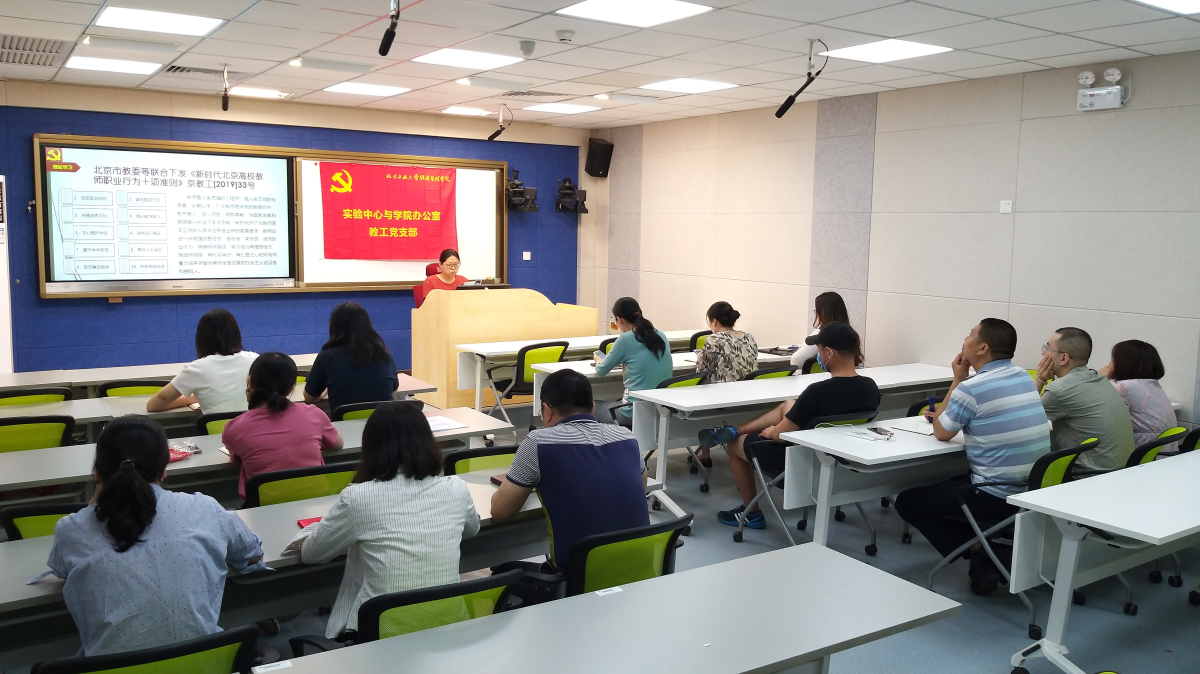 为深入贯彻执行市委教工委、市教委、市人力社保局印发的师德建设相关文件精神,Beat365官方网站实验中心与办公室教工党支部于6月13日下午在励学楼135开展师德建设集中理论学习活动。此次学习活动由中办党支部书记牛天勇同志主持,经管学院实验中心、行政办公室、党务办公室和学生工作办公室的16名教职工参加了本次学习活动。