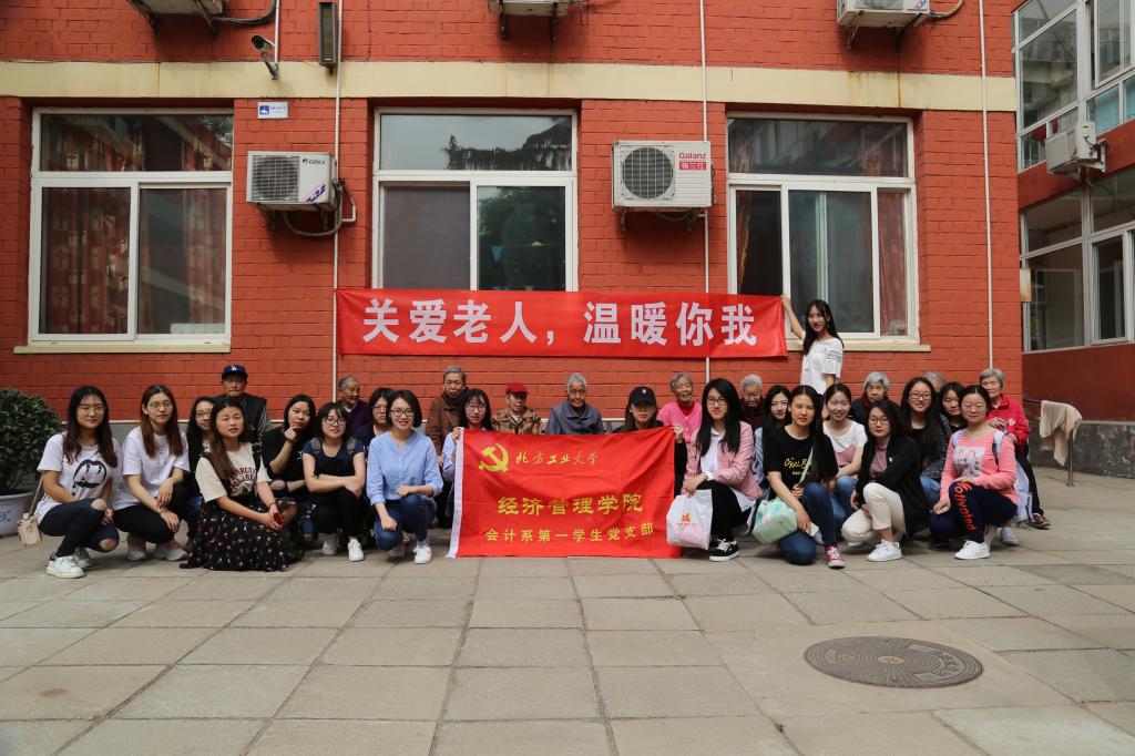2018年5月5日上午,Beat365官方网站会计系第一学生党支部开展了红色1+1活动。支部的同学们来到北京市石景山区老年福敬老院关爱老人,同学们到敬老院的时候,恰逢老人们在户外锻炼,晒太阳。支部的同学们便主动为老人们送上了带来的慰问礼物,陪老人们聊聊家常,听老人们唠叨唠叨过去的事,给老人们送去了温暖和关爱。老人们看到充满活力的年轻人,特别的开心,欢声笑语充满了整个院子。欢乐的时光飞逝,全体支部同学和老人们一起合唱歌曲结束了本次慰问活动。
